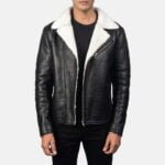 Arctic Outfits brings you a Alberta Shearling Black Leather Biker Jacket is easy to wear because of its Premium Quality Full Grain Leather and its has two side waist zipper pockets outside to keep your hands warm in winter, One Slightly Vertical Chest Pocket and one inside mobile stash pocket to keep your valuable items safe, regular fit, front YKK Zipper Closure With Spread collar, Open Hem Cuffs for features a classic bomber look with an asymmetrical zip closure, adding a touch of edginess to your outfit, making it suitable for various body types extend your wardrobe with exclusive styles.