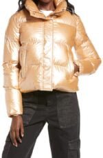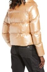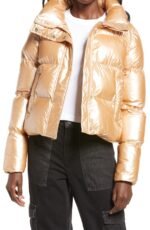 This lightweight puffer jacket is enhanced by a metallic finish and cropped silhouette.