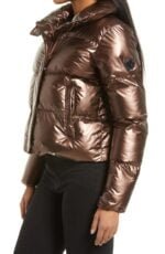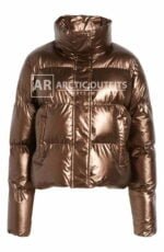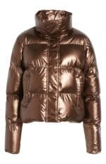 This lightweight puffer jacket is enhanced by a metallic finish and cropped silhouette.