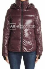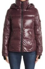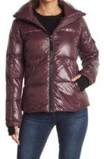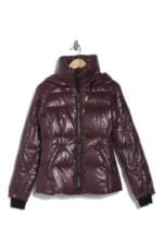 A glossy, hi-shine finish elevates this cold weather-friendly, puffer coat.