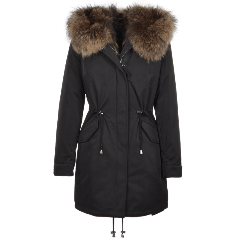The hood features sumptuous fox fur trim that adds a touch of elegance, while the detachable raccoon fur lining provides extra warmth and versatility. The black color adds a classic and sophisticated look to any outfit. With its high-quality construction and premium fur accents, this parka is a must-have addition to your winter wardrobe.