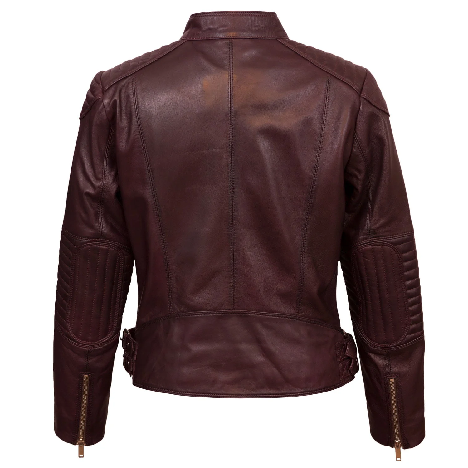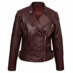 Arctic Outfits brings you a Lady Maroon Biker Leather Jacket is easy to wear because of its Premium Quality Full Grain Leather and its has two side waist pockets outside to keep your hands warm in winter, Two Chest Pockets and one inside mobile pocket to keep your valuable items safe, snap on Collar, Open hem cuffs, front snap button and YKK Zipper Closure features a classic bomber look with an asymmetrical zip closure, adding a touch of edginess to your outfit, making it suitable for various body types extend your wardrobe with exclusive styles.