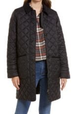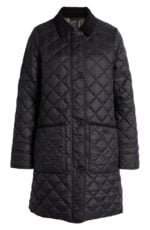 Diamond quilting, a corduroy-trimmed collar and a longline silhouette add up to signature Barbour style in a lightweight jacket. Roomy patch pockets at the front allow you to keep your cards, phone, keys or cash handy.