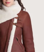 Made out of durable quality sheepskin leather, this jacket has fur stitched inside of it that makes it thoroughly comfortable to flaunt the outfit with great ease. Bold and dandy brown in color, the jacket has widespread smart belted fur collars and the waistline and cuffs are lined with fur too. The Womens Shearling Jacket closes with a zipper that has a tightening strap complementing it for a nice fit.